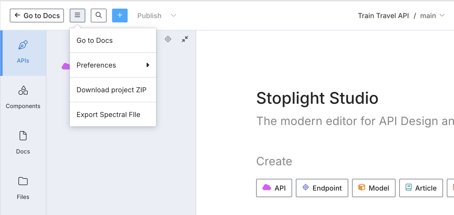 Exfiltrating your OpenAPI and Markdown from Stoplight is as simple as exporting a ZIP file of your OpenAPI and other documents.